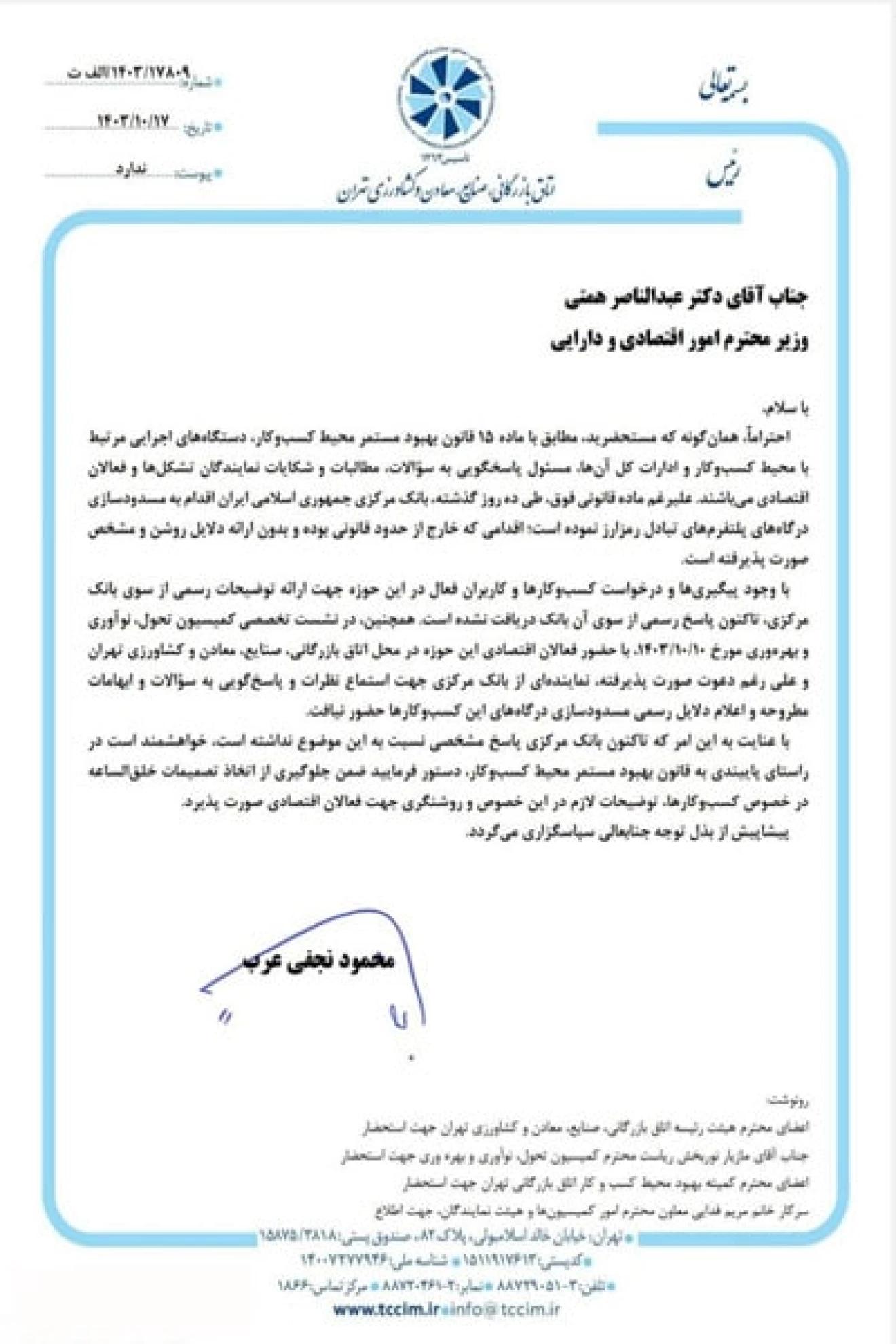 اخیراً نامهای مهم از سوی محمود نجفی عرب، رئیس اتاق بازرگانی تهران، به وزیر اقتصاد در خصوص مسدودسازی درگاه صرافیهای ارز دیجیتال ارسال شده است.در این نامه، نجفی عرب ضمن انتقاد از اقدام بانک مرکزی در مسدودسازی درگاههای پلتفرمهای ارز دیجیتال، خواستار شفافسازی درباره این تصمیم شده است.در همین راستا، فاطمه مهاجرانی، سخنگوی دولت، در نشست خبری امروز اعلام کرد که طبق گفته بانک مرکزی، درگاههای رمزارز بسته نیستند، بلکه تنها درگاههای خرید توسط این بانک مسدود شدهاند و سایر درگاهها همچنان فعال هستنداو توضیح داد که این اقدام به دلیل مسئولیت بانک مرکزی در مدیریت بازار ارز انجام شده و تصمیمات بعدی نیز بر اساس همین رویکرد اتخاذ خواهد شد.با این حال، مسدودسازی اخیر درگاههای صرافیهای ارز دیجیتال با واکنشهای گستردهای از سوی کسبوکارها و کاربران این حوزه روبهرو شده است. دولت تأکید کرده که بانک مرکزی باید دلایل این تصمیم را شفافسازی کند، اما تاکنون هیچ واکنش رسمی از سوی این نهاد ارائه نشده است.نجفی عرب در نامه خود به وزیر اقتصاد یادآوری کرده که بانک مرکزی طی ده روز گذشته، بدون ارائه دلایل روشن، این اقدام را انجام داده است. وی همچنین اشاره کرده که تلاشهای متعدد فعالان اقتصادی برای دریافت توضیحات از بانک مرکزی تاکنون بینتیجه بوده است.حتی دعوت رسمی از نمایندگان بانک مرکزی برای حضور در نشست تخصصی کمیسیون تحول و نوآوری در تاریخ ۱۰ دیماه نیز پاسخ داده نشده است.رئیس اتاق بازرگانی تهران در پایان از وزیر اقتصاد خواسته است تا با صدور دستورات لازم، از اتخاذ تصمیمات خلقالساعه جلوگیری کرده و بانک مرکزی را ملزم به ارائه توضیحات به کسبوکارها و کاربران کند..