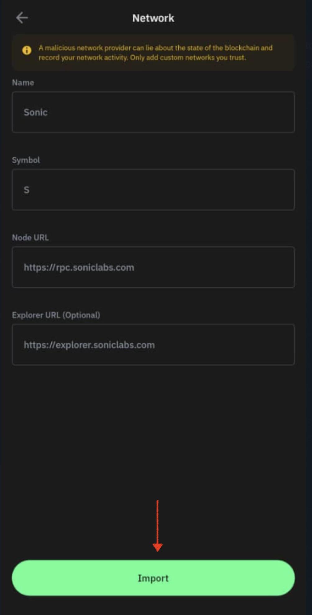 وقتی روی import بزنید شبکه سونیک به کیف پولتون اضافه میشه اگر فانتوم رو تبدیل نکردید به سونیک میتوانید الان راحت انجام بدید