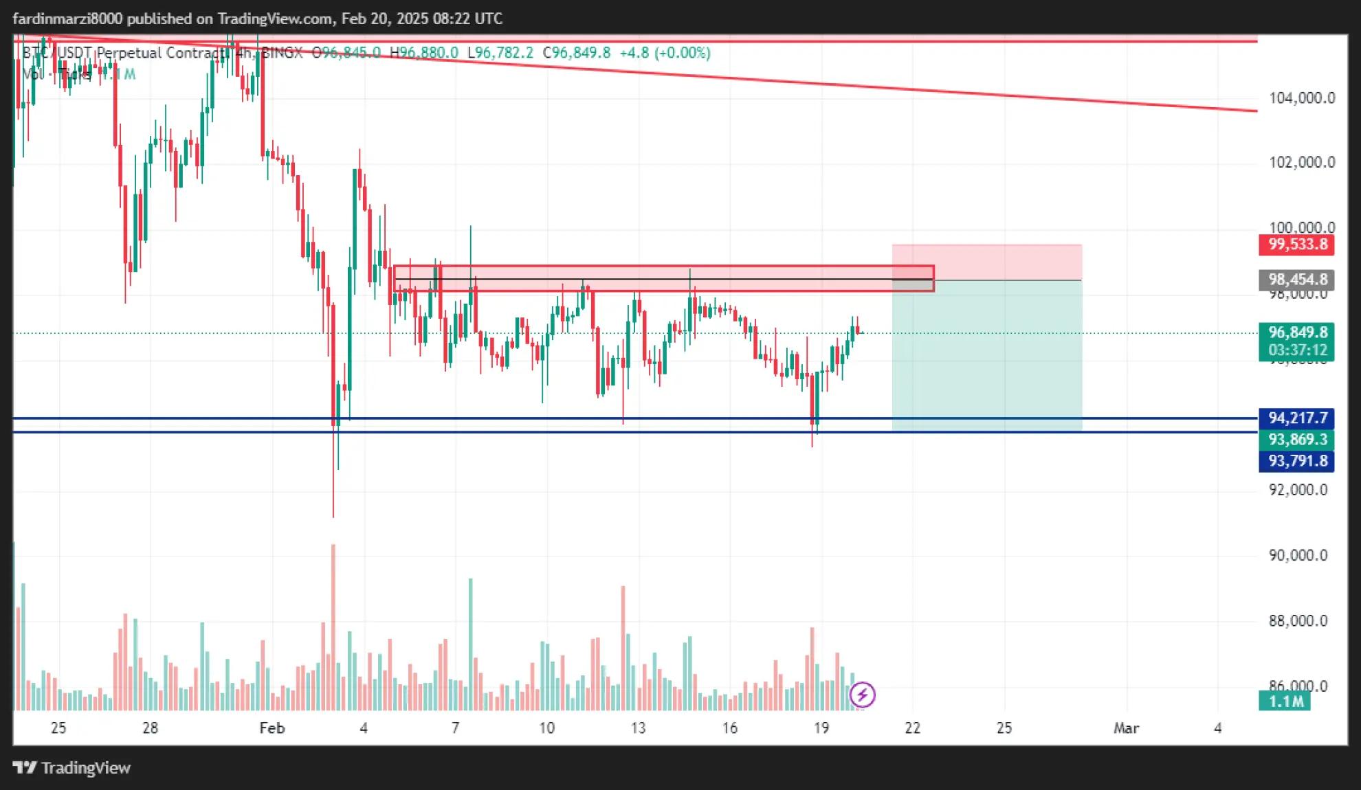 سلام به همگی همراهان گرامی وقتتون بخیر با توجه به حمایت ناحیه 93تا93500واکنش خوبی داشت الان 98تا98500مقاومت خیلی مهمی است ک انتظار دارم واکنشی به این ناحیه داشته باشیم و ریزشی تا نواحی مد نظر داشته باشیم اگر بالا تر از ناحیه 99500در تایم فریم 4 ساعته تثبیت ببینیم میتونه صعودی داشته باشه تا نواحی 100500---101500----102500پس اگر وارد معاملهselحتما حد ضرر بزاریدموفق و پر سود باشید