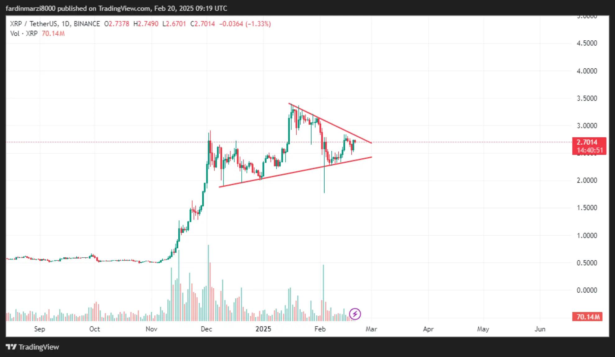 ارز ریپل در تایم فریم روزانه در داخل این مثلث است که سقف مثلث 2.800است