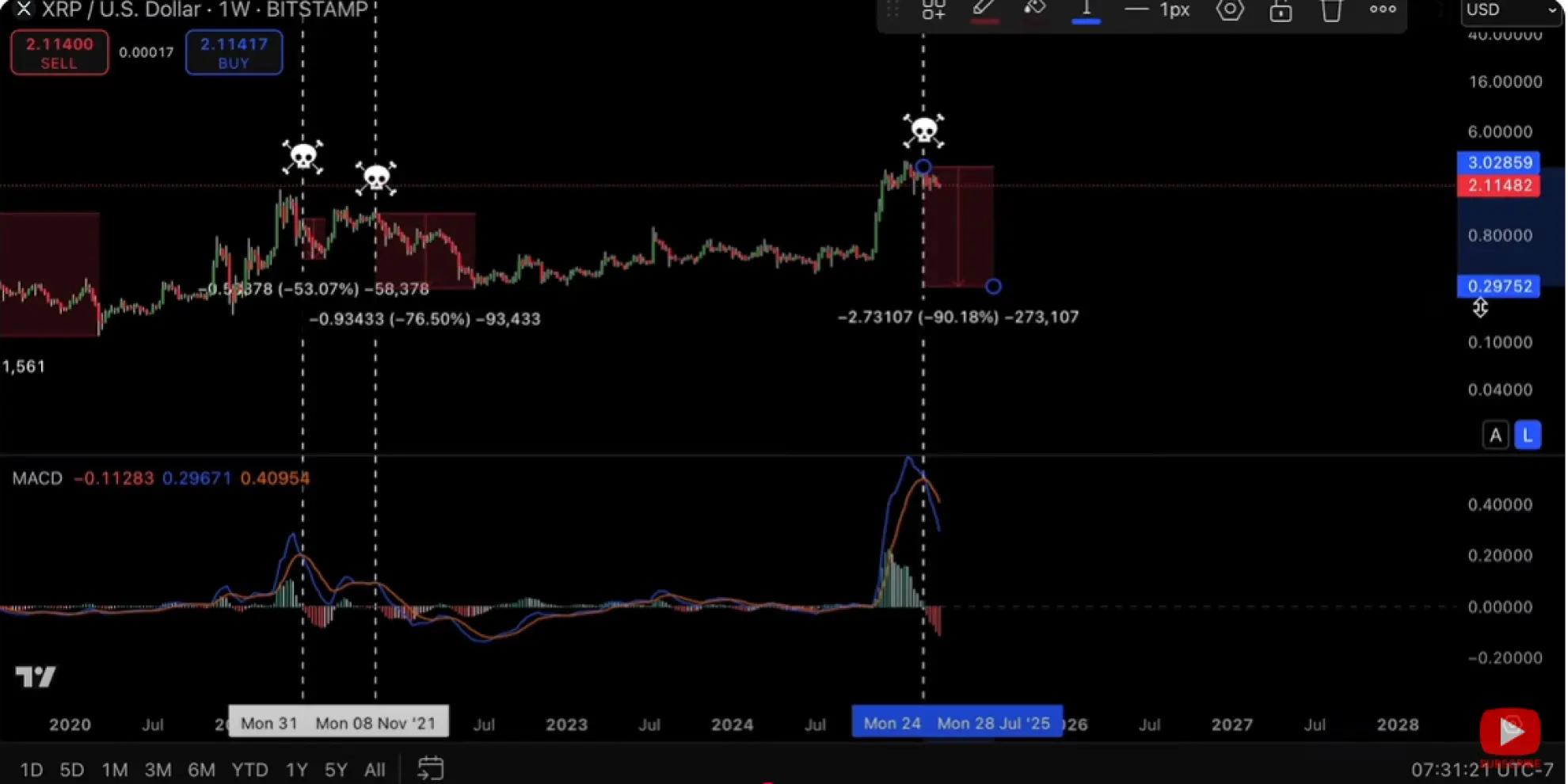 اگر تاریخ تکرار شود، (XRP) ممکن است شاهد کاهش دیگری باشد. کاهش ۵۳٪ از قیمت فعلی میتواند این رمزارز را به حدود ۱.۴۰ دلار برساند. اگر افت مشابه کاهش ۲۰۲۱ باشد، ممکن است قیمت به ۰.۷۱ دلار برسد. در بدترین سناریو، اگر (XRP) مسیر سقوط ۲۰۱۸ را دنبال کند، قیمت ممکن است زیر ۰.۳۰ دلار برود.